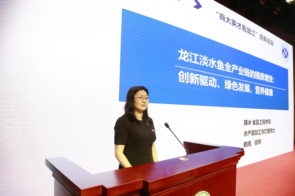 我校食品工程学院食品工程教研室教师韩冰教授以《龙江淡水鱼全产业链的提质增效:创新驱动、绿色发展、营养健康》为题作报告。