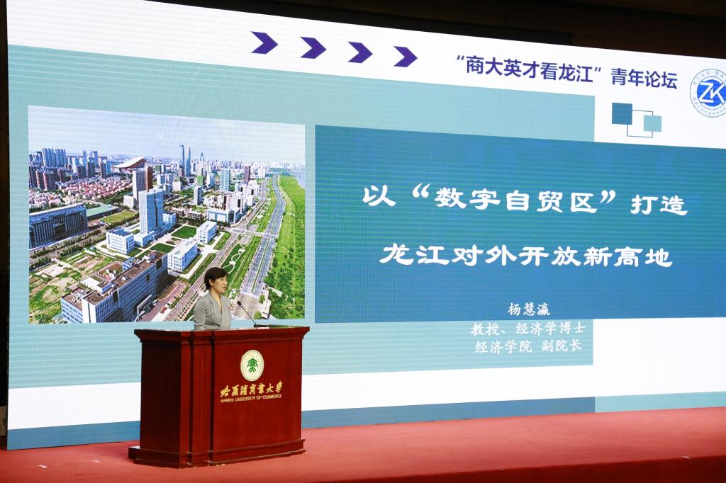 我校经济学院副院长杨慧瀛教授以《以“数字自贸区”打造龙江对外开放新高地》为题作报告。