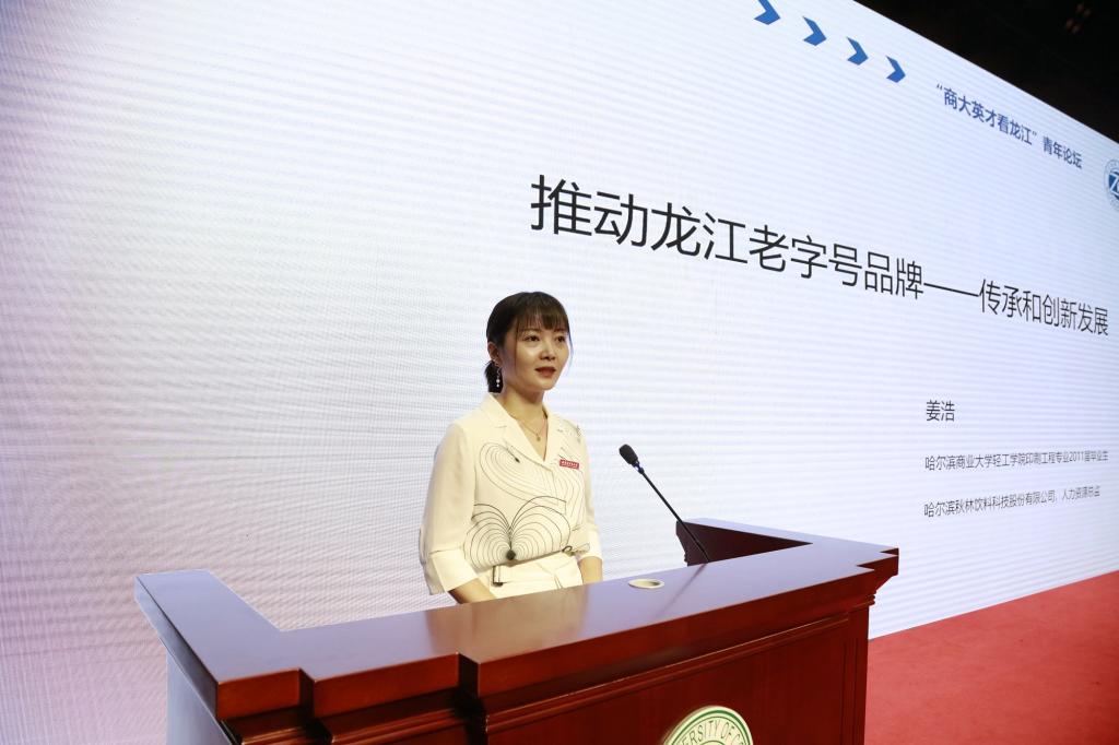 2007级印刷工程专业校友、哈尔滨秋林饮料科技股份有限公司人力资源总监姜浩以《推动龙江“老字号”品牌传承和创新发展》为题作报告。