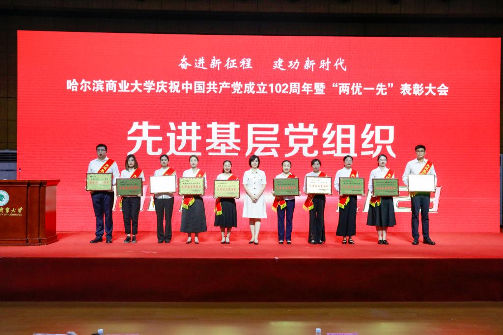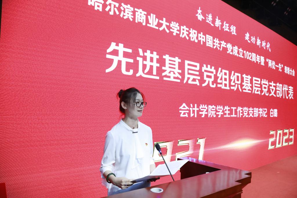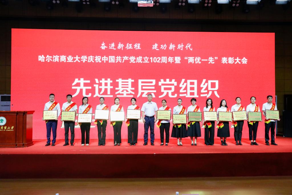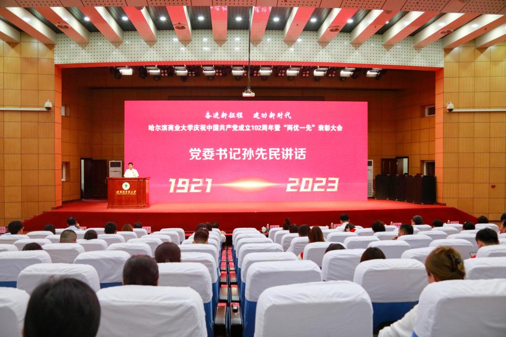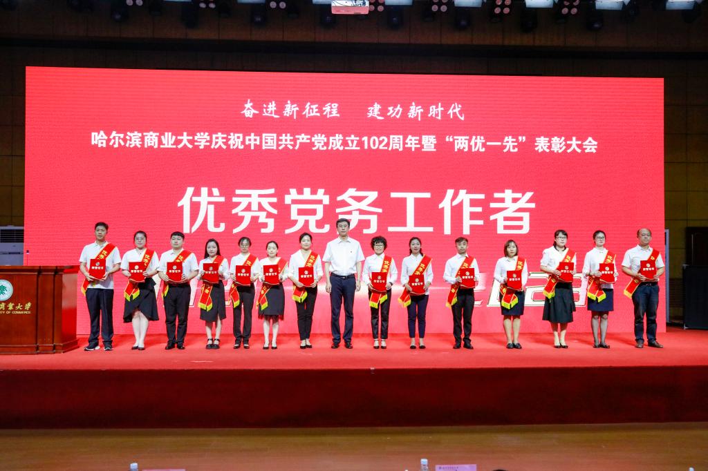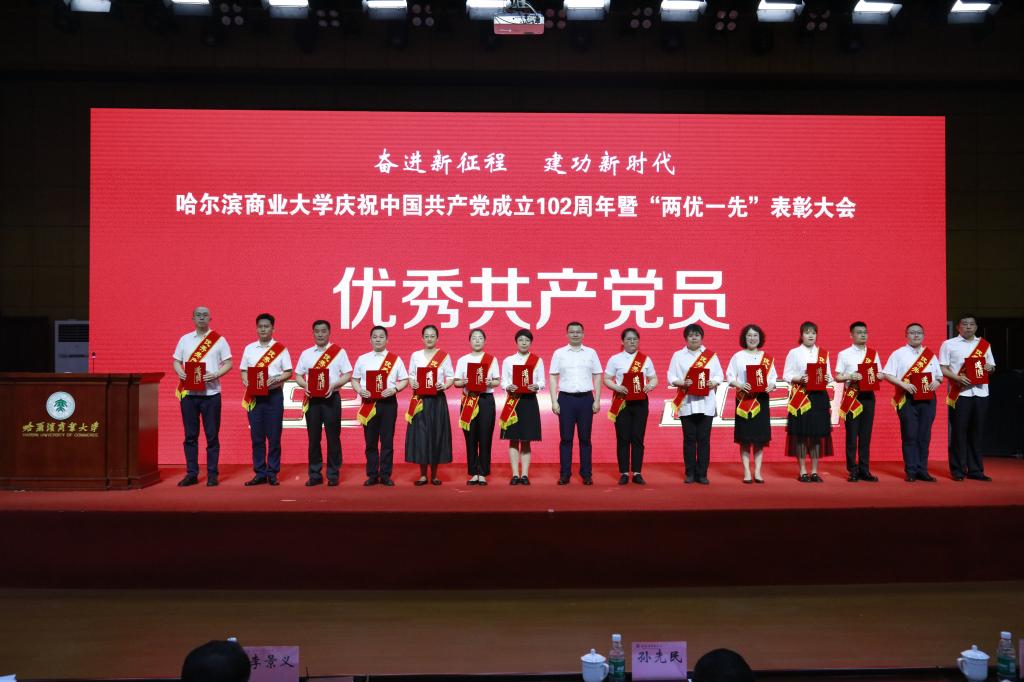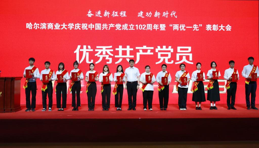在雄壮的国歌声中,大会正式开始。李景义宣读《关于表彰2021—2023年度哈尔滨商业大学优秀共产党员、优秀党务工作者和先进基层党组织的决定》。王巍为获得优秀共产党员学生代表,赵大伟为获得优秀共产党员教师代表,卢伯松为获得优秀党务工作者代表,党委常委、宣传部部长贾妮燕为获得先进基层党组织基层党委(党总支)代表,党委常委、统战部部长白云龙为获得先进基层党组织基层党支部代表颁发“两优一先”获奖证书及奖牌。