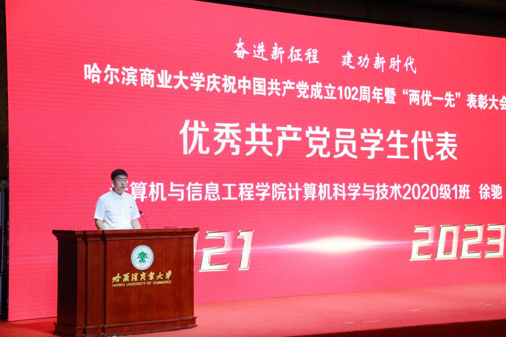 优秀共产党员学生代表、计算机与信息工程学院计算机科学与技术2020级1班徐驰讲述了自己在党的培养与呵护下所取得的成绩,并表示在今后的学习、工作和生活中,将珍惜这份荣誉,谦虚谨慎,再接再厉,不辜负党组织的殷切期望,践行共产党人的初心和使命,更好地发挥党员先锋模范作用,积极投身新时代中国特色社会主义伟大实践,争做实现中华民族伟大复兴的先锋力量。