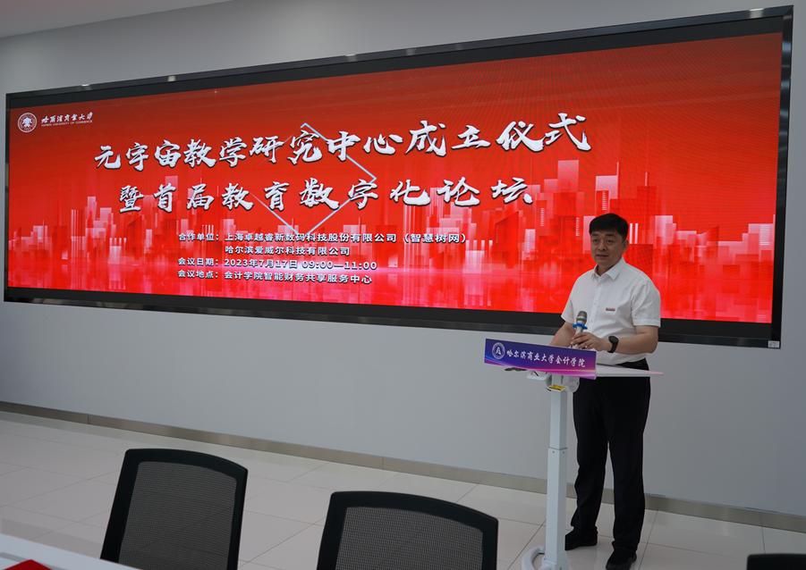 7月17日上午,由哈尔滨商业大学与上海卓越睿新数码科技股份有限公司(智慧树网)、哈尔滨爱威尔科技有限公司合作成立的“哈尔滨商业大学元宇宙教学研究中心”成立仪式暨首届教育数字化论坛在会计学院智能财务共享服务中心举行。我校副校长王巍、教务处处长徐耀群、会计学院院长张劲松,智慧树网营销副总裁李廷,哈尔滨爱威尔科技有限公司总经理项征以及我校教师代表参加仪式。徐耀群主持仪式。