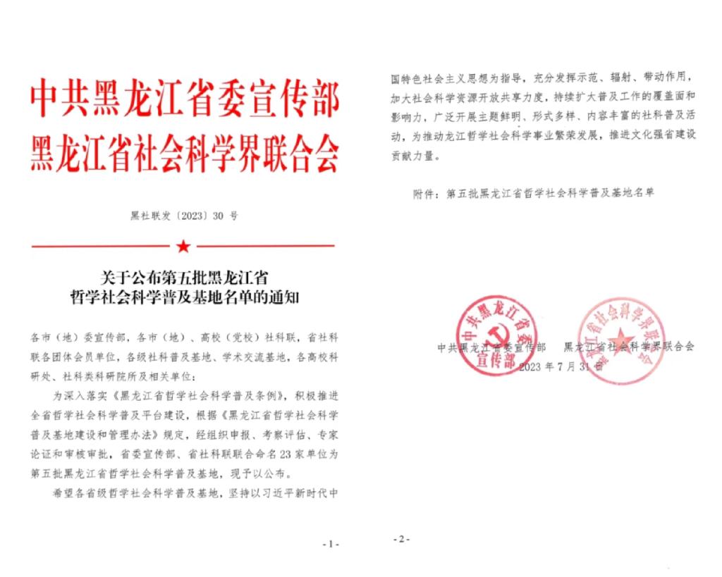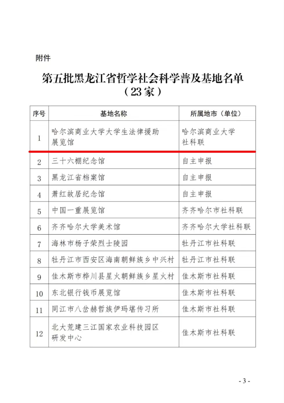 日前,中共黑龙江省委宣传部、黑龙江省社会科学界联合会联合发布《关于公布第五批黑龙江省哲学社会科学普及基地名单的通知》,经过材料申报、考察评估、专家论证、审核审批等环节,我校大学生法律援助展览馆获批第五批黑龙江省哲学社会科学普及基地,这是我校继商业文化馆之后,获批的第二个黑龙江省哲学社会科学普及基地,是我校哲学社会科学领域新的突破。