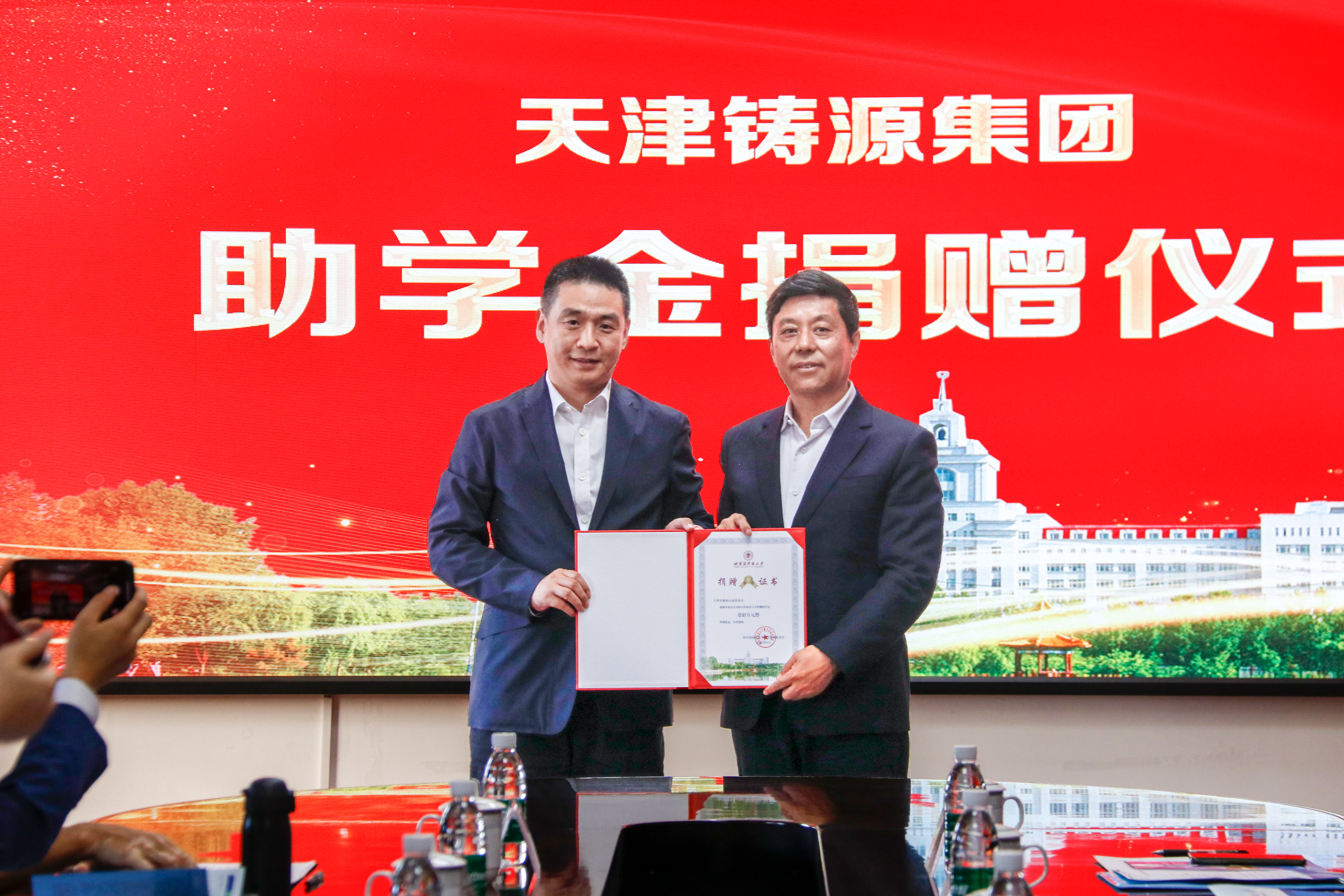 郭世梁与我校大学生就业创业指导中心主任潘俊峰共同展示捐赠凭证。