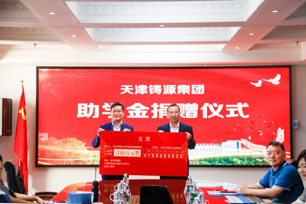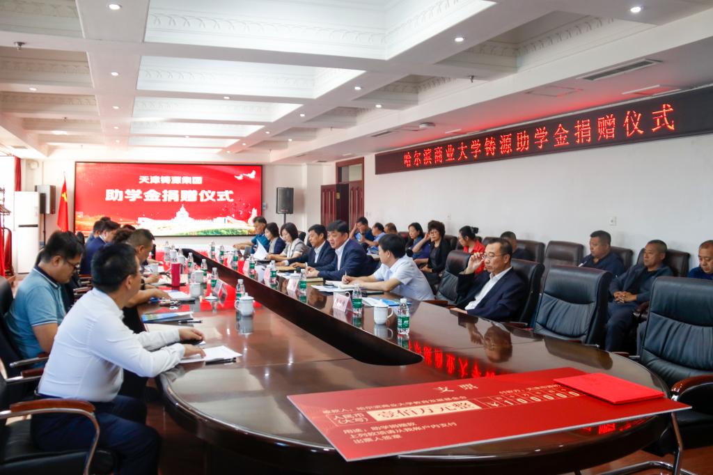 9月14日,哈尔滨商业大学铸源助学金捐赠仪式在我校行政楼三楼会议室举行。天津铸源集团常务副总裁王纪伟、运维总监郭世梁、市场综合业务服务中心主任党新华;黑龙江省新业态发展促进会会长任筱梅、秘书长王润涛;原哈尔滨技师学院院长朗益夫;极光新闻记者郎艾迪以及我校党委书记孙先民、副校长王巍出席仪式。学校宣传部、教务处、学生工作部、大学生就业创业指导中心等相关部门以及各学院负责人参加会议。王巍主持仪式。