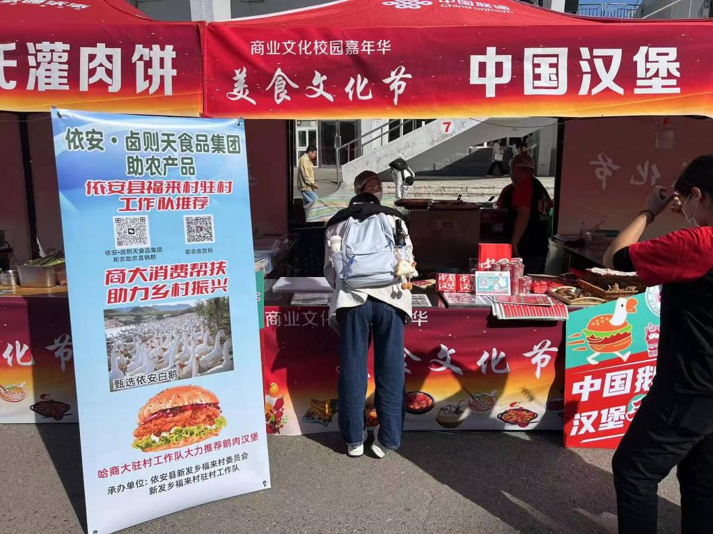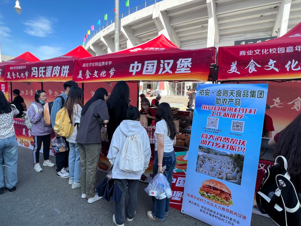 由驻村工作队力荐的依安县“鹅肉汉堡”参加了哈尔滨商业大学商业文化校园嘉年华活动,受到广大师生的热烈欢迎。