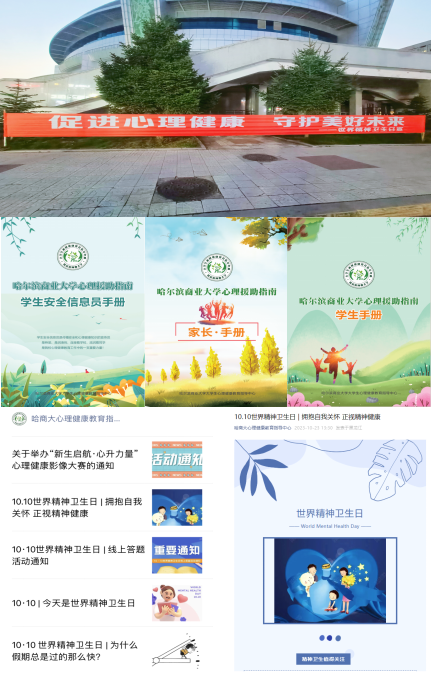 为了进一步提升学生的心理健康意识,学生工作部大学生心理健康教育指导中心精心制作了哈尔滨商业大学心理援助指南安全信息员及寝室篇、家长篇、学生篇。大学生心理健康教育指导中心以及各学院还通过横幅、微信公众号等多种载体开展心理健康知识宣传,普及心理健康知识和精神文明理念,倡导健康生活方式和心理保健意识,引导学生积极阳光、健康快乐。