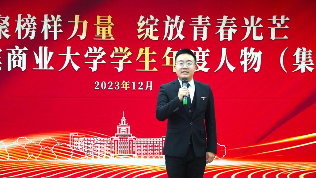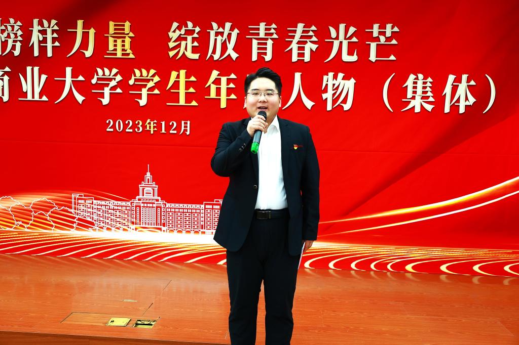 副校长姜国峰在讲话中指出,2023年学校各级团组织积极发挥共青团凝聚青年、引领青年、服务青年的职责,通过开展“青春向党 奋斗强国”青年文化节、“青年大学习”网上主题团课、“青马工程”学生骨干送学上门、乡村振兴调研、社会实践等系列活动,以点带面引领全校团员和青年坚持不懈用习近平新时代中国特色社会主义思想凝心铸魂,不断增强“四个意识”、坚定“四个自信”、做到“两个维护”,以满腔热忱奋进新征程。在勤奋学习、自强自立、创新创业、志愿服务等方面涌现出一批取得突出成绩的个人和集体,本次表彰大会的召开旨在进一步激励同学们向榜样学习,坚定理想信念,奋发有为,争做有理想、敢担当、能吃苦、肯奋斗的新时代好青年。姜国峰对广大商大青年提出殷切希望,一是新时代的青年要“胸怀国之大者,立高远之志”,深入学习贯彻习近平新时代中国特色社会主义思想,坚定拥护“两个确立”、坚决做到“两个维护”,向着第二个百年奋斗目标而努力奋斗。二是新时代的青年要“明辨是非修品德,恪守正道方向清”,深入践行社会主义核心价值观,在投身志愿服务、助力乡村振兴中,不断提升个人能力素质、道德修为,努力争做品德高尚、人格健全的时代新人。三是新时代的青年要“业广惟勤,学无遗力”,面对科技进步、知识更新不断加快的形势,要刻苦学习,在增长知识才干上持续用力,练就报效祖国、服务人民的真功夫。四是新时代的青年要“矢志初心创新愿,砥砺前行勇担当”,保持推陈出新的意识和干劲,在创新创造中自我革新、自我完善,在不懈奋斗中实现人生理想。