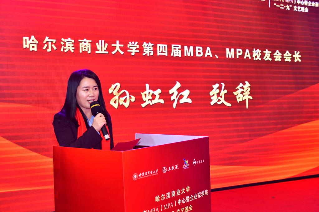 第四届MBA、MPA校友会会长、哈药集团营销有限公司团委书记孙虹红在讲话中表示,感谢学校和学院的各位领导对校友会工作的支持和引导,感谢一路走来相互支持、相互信任的校友们,也衷心希望校友们利用校友会的平台,携手共进,共同发展,为地方经济发展助力,为母校高质量发展赋能,愿母校为龙江全面振兴全方位振兴培养更多商界领袖和政界精英。