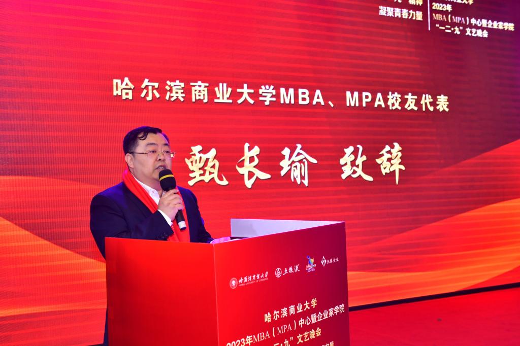黑龙江自贸试验区哈尔滨片区专职副主任甄长瑜作为MBA、MPA校友代表发言。他表示,黑龙江作为国家向北开放的新高地,我们应担负起龙江全面振兴全方位振兴的历史使命,感恩母校的培养和老师们的辛勤付出,愿师弟师妹们心中有梦想,脚下有力量;愿校友们事业长虹,蒸蒸日上,为母校MBA、MPA教育和企业家学院发展贡献力量。