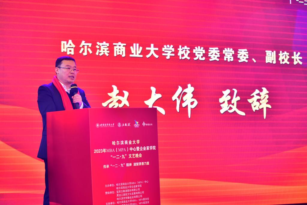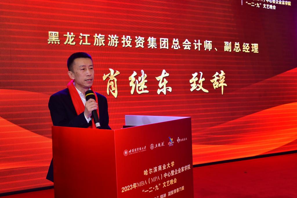 12月16日,由哈尔滨商业大学MBA(MPA)中心和企业家学院主办,五粮液集团、黑龙江旅投文化发展有限公司、恒缘金业有限公司赞助,在哈尔滨商业大学MBA、MPA校友会和MBA、MPA联合会大力支持下,我校2023年MBA(MPA)中心暨企业家学院“一二·九”文艺晚会在哈尔滨友谊宫金色大厅举办。莅临晚会的领导和嘉宾有哈尔滨商业大学副校长赵大伟,黑龙江旅游投资集团总会计师、副总经理肖继东,五粮液集团黑龙江省行政经理李梅;我校职教学院继教学院MBA(MPA)中心党委书记赵金梅,MBA(MPA)中心副主任、企业家学院常务副院长代碧波,MBA(MPA)中心副主任李娟。同时,邀请了MBA、MPA任课教师代表和优秀MBA、MPA校友代表亲临晚会现场,400余名MBA、MPA师生齐聚一堂,重温往昔峥嵘岁月。
