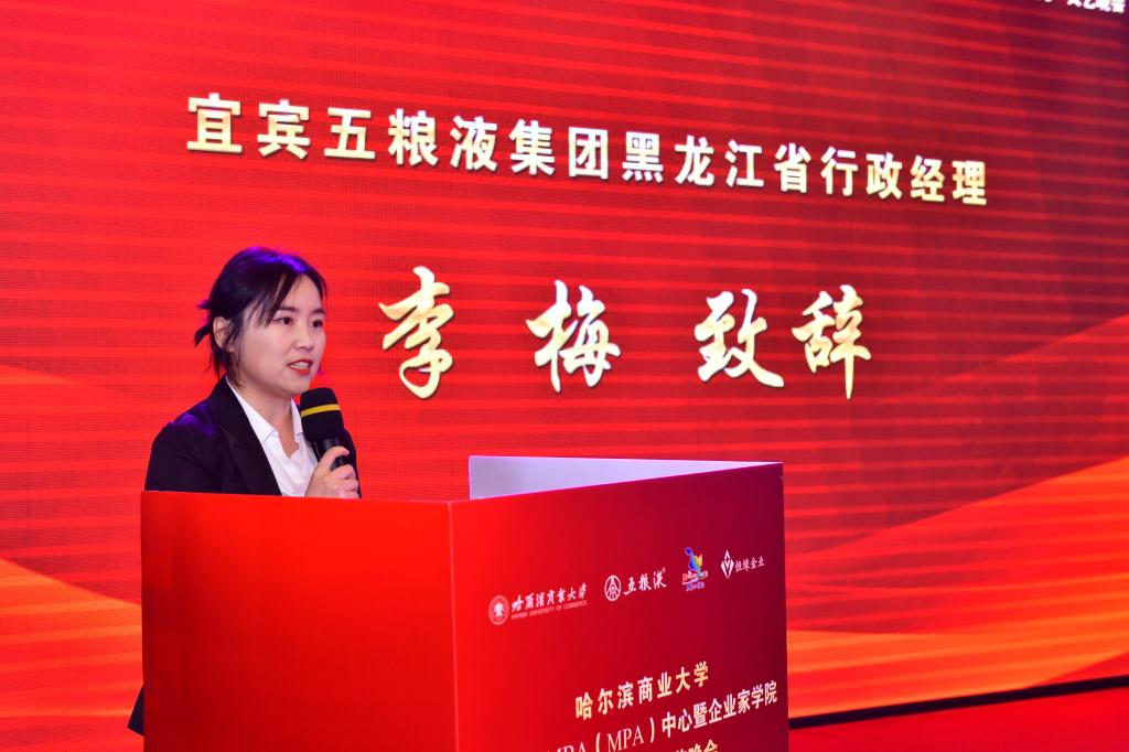 李梅在发言中分享了五粮液集团的企业文化和品牌理念。她表示,作为世界500强和中国100强的知名企业,愿与哈尔滨商业大学加强校企战略合作,传递五粮液“和美”文化,为企业今后的多元化发展打造更加坚实的人才基础。