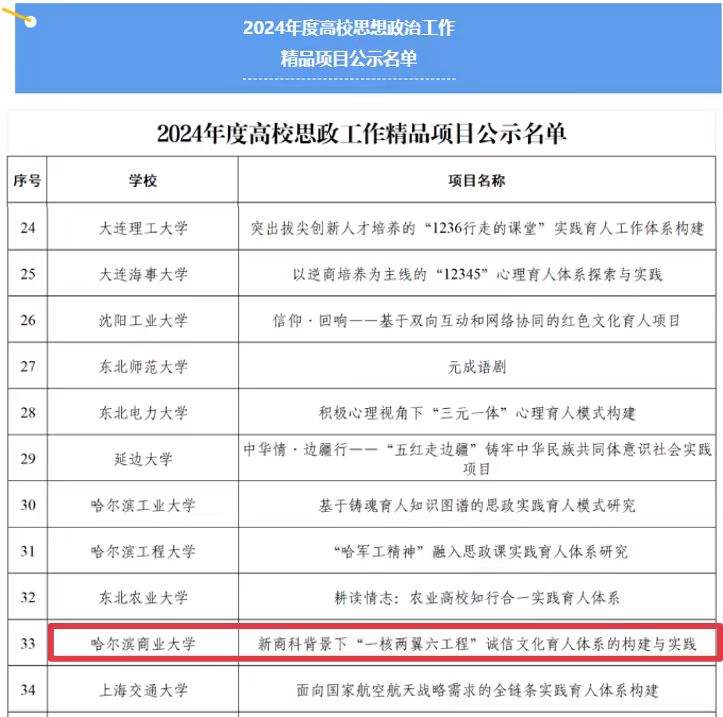 近日,教育部公示了《2024年度高校思想政治工作质量提升综合改革与精品建设项目遴选结果》,我校党委宣传部申报的《新商科背景下“一核两翼六工程”诚信文化育人体系的构建与实践》首次入选“高校思想政治工作精品项目”,实现我校思想政治工作领域在教育部立项的新突破,成为学校思想政治工作重要标志性成果。