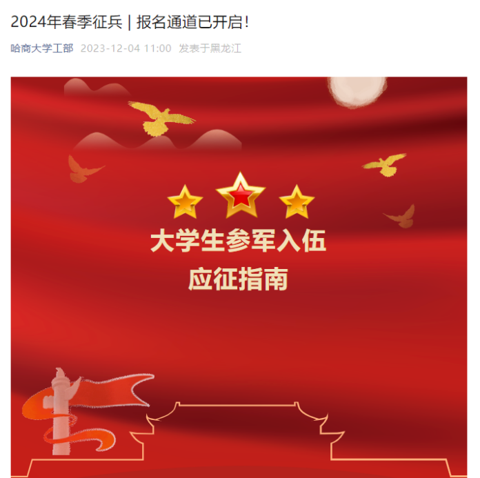 创新宣传途径,形成征兵合力。实现征兵宣传线上全覆盖,线下无死角。在全国征兵报名通道开启第一时间,制作征兵宣传推文,明确征兵报名时间、身体基本条件、应征报名流程、参军优待政策等内容,通过“哈商大学工部”微信公众号进行发布,让全校学生都能够看到征兵相关政策。印制黑龙江省征兵政策宣传材料,分别发放至毕业生和有参军意愿的学生手中,帮助其了解黑龙江省相关优待政策,鼓励引导更多优秀青年到军营实现梦想。