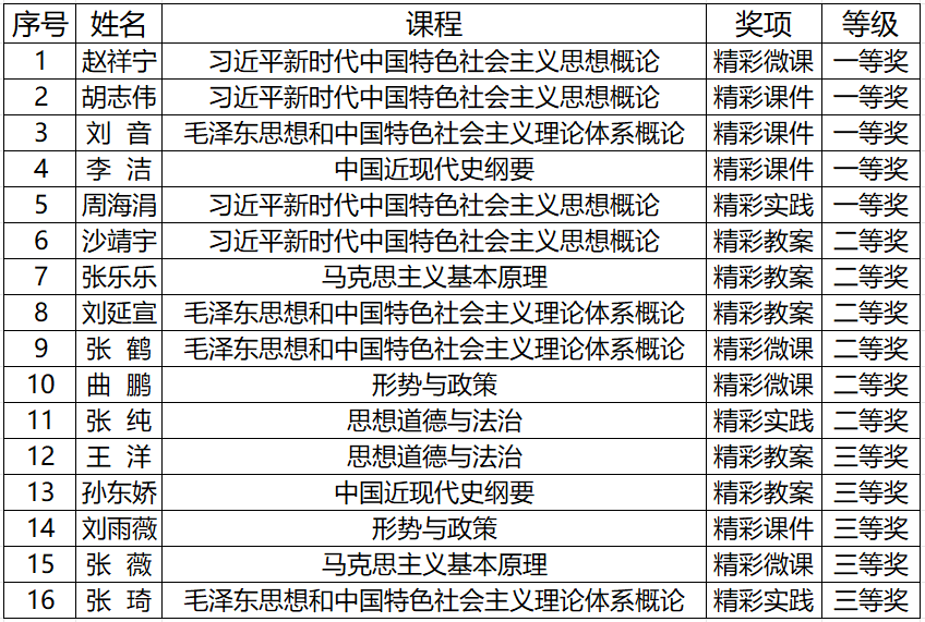 高校思想政治理论课“精彩系列”教学成果每两年评选一次,是全省高校思政课教学成果的重要组成部分。本次比赛以课程为单位,共设置“精彩教案”“精彩课件”“精彩微课”“精彩实践”四个类别。马克思主义学院高度重视、积极组织,对各教研室参赛作品进行精心打磨和指导,学院教师踊跃参加,最终荣获16项奖项,实现了课程门类和竞赛单元获奖全覆盖,创学院历届参赛最好成绩。