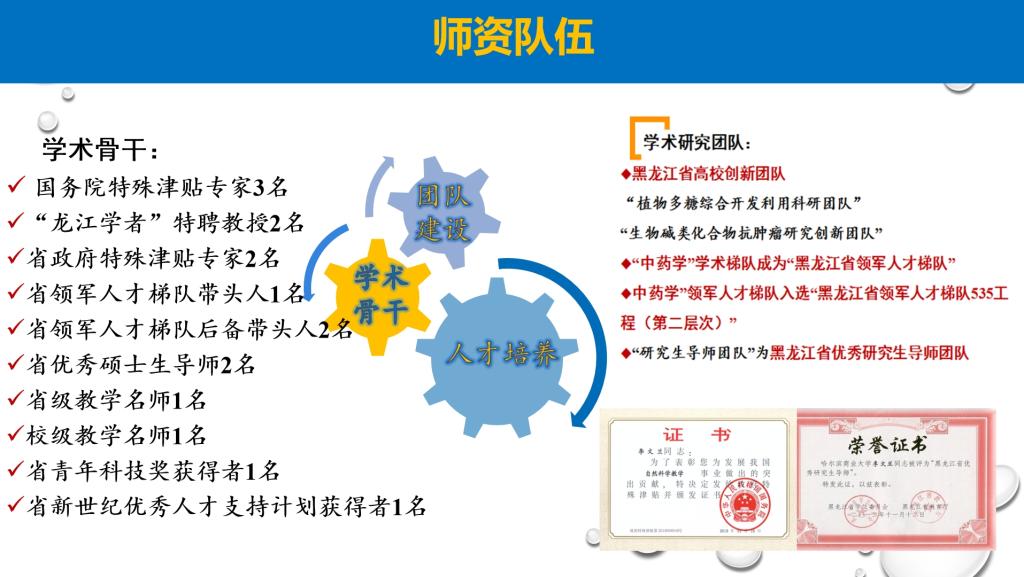 学科重视团队建设,高端人才的引、培建设等工作,历经多年建设,团队梯队结构进一步优化,建设水平显著提升。学科现有教职工88人,拥有国务院特贴专家3人、龙江学者2人、省政府特贴专家2人、省级学科带头人1人、后备带头人2人、省优秀硕士生导师2人、省级教学名师1人、省师德师风先进个人1人、省青年科技奖获得者1人、省新世纪优秀人才支持计划获得者1人;省高层次人才C类1人、D类6人、E类16人;学校镜湖学者2人。拥有1个“黑龙江省中药学领军人才梯队(535工程)”、“黑龙江省优秀研究生导师团队”2个和“植物多糖综合开发利用”、“生物碱类化合物抗肿瘤研究”黑龙江省科技创新团队2个。2023年,学科“中药药效物质基础及作用机制研究生导师团队”入选“黑龙江省优秀研究生导师团队”。2023年,学科梯队获批校科技创新团队。