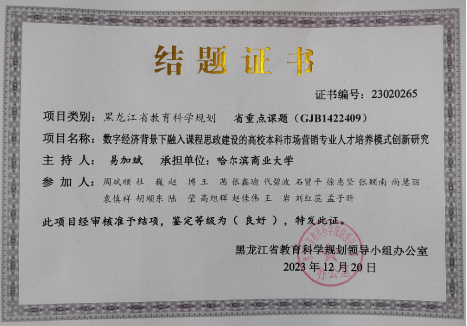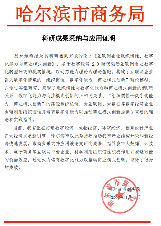 积极推动教育科研成果转化应用,近5年来,承担教育部、财政部重点招标课题及教育部产学合作协同育人项目5项;主持参与国家级、省级科研项目近20项。先后为黑龙江中惠集团、黑龙江盐业集团有限公司、黑龙江供销集团等多家企业提供战略、管理、营销等咨询服务。团队成员作为黑龙江省公共政策与现代服务业创新智库专家,参与完成“哈尔滨新区(江北一体发展区)养老服务体系发展规划”制定工作。为各级政府及相关企事业单位举办组织转型、农产品营销等专题培训30余场次,多项研究成果被采纳并推广应用。