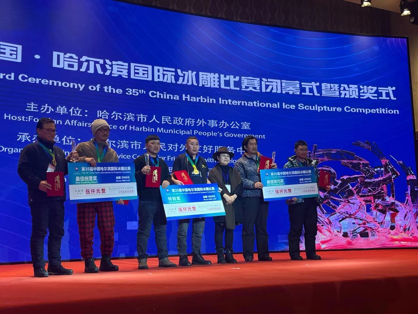 冰雪创意设计工作室负责人张鹏举老师参加“第35届中国·哈尔滨国际冰雕比赛”,获得最佳技巧奖;并在“全国雪雕艺术邀请赛”中获得三等奖。
