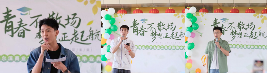 毕业生代表王华锋、姜好玉、杨海鹏三位同学分别在主持词中和发言中表达了对学校的培育、学院的栽培、各位老师的培养、辅导员日常关爱的感激之情,以及对同学们的不舍。