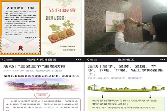 另外,其他学院也开展了以“三爱三节”为主题的征文活动、宣传板报和手抄报展示、主题班会以及社会调查活动,还有部分学院通过采访学生和老师,拍摄了“三爱三节”的相关视频。一系列活动的开展帮助学生明确了人生意义和学习目标,进一步增强了青年学生的社会责任感。
