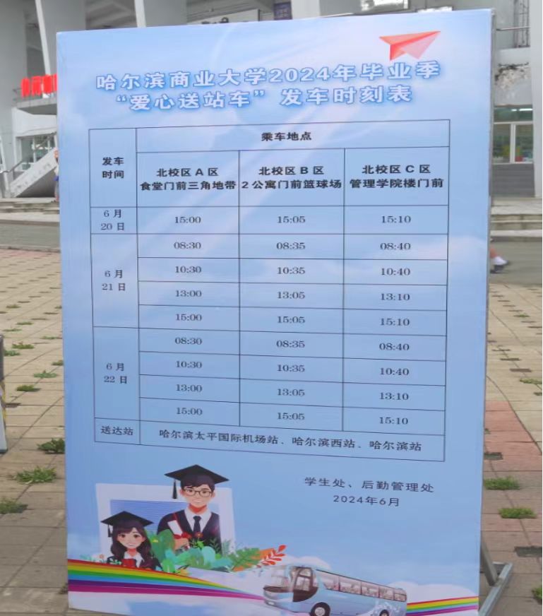 伴着离别歌声的响起,2024届毕业生即将离开熟悉的校园,挥别辛勤的老师,道别朝夕相处的同窗好友,满怀不舍与留恋乘着离别的列车驶向新的征程。为了让毕业生能够顺利、安全、便捷地离开校园,学生处、后勤管理处及保卫处联合哈尔滨公交集团于6月20日—22日开展“暖心送站”服务,共计发车27次,为毕业生的归乡之路暖心护航。