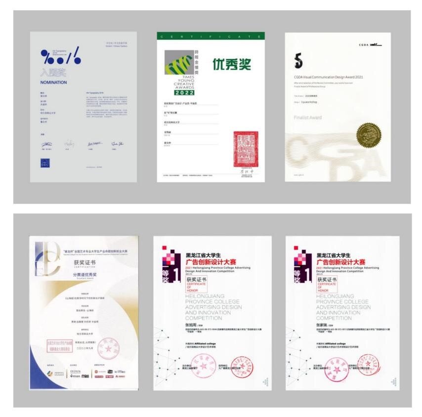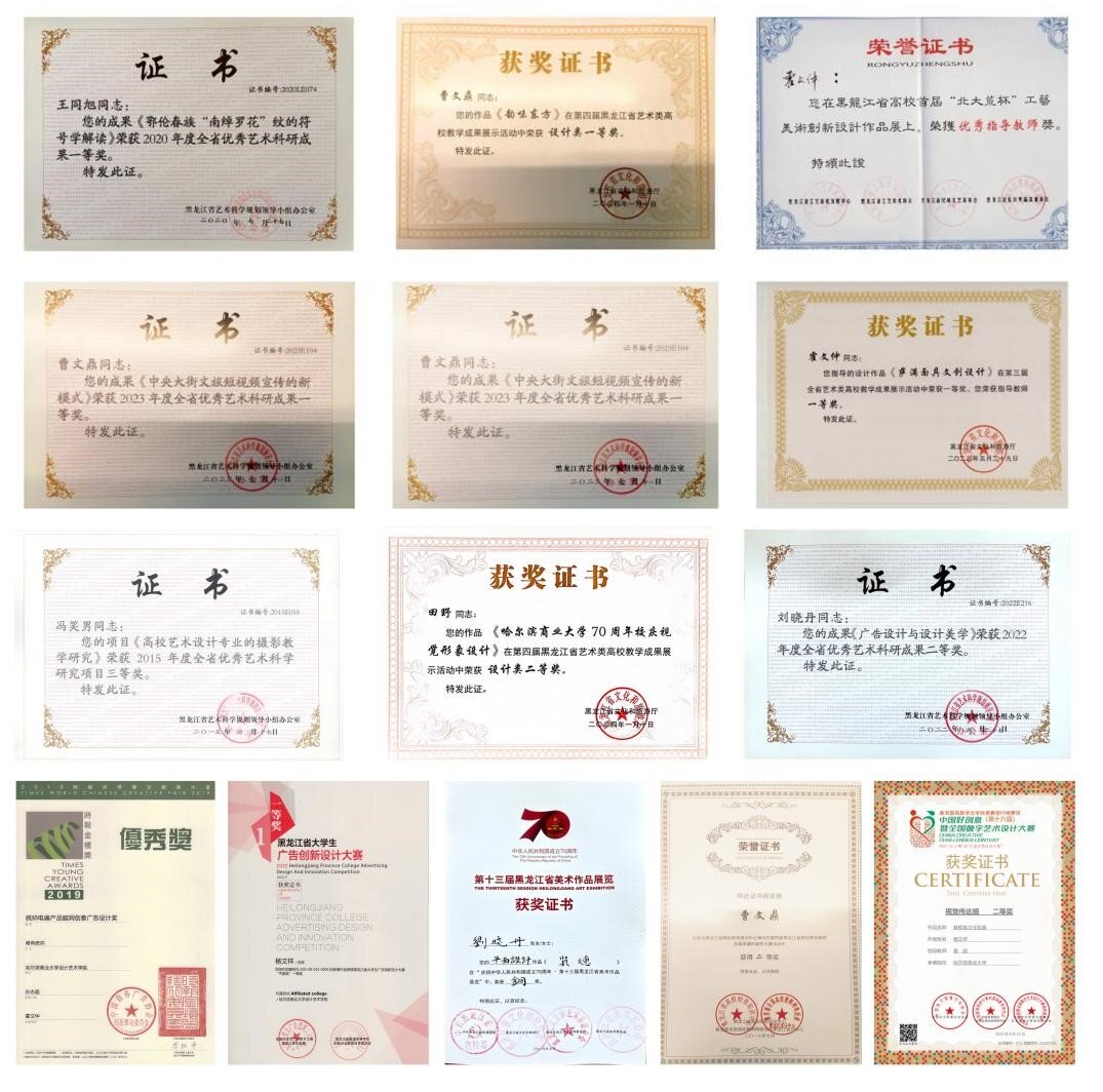 视觉传达设计专业现有18名专业教师,其中教授2人,副教授9人。专业高度重视教学内容优化与教学方法提升,组建跨部门、跨学科的教学研讨,营造思维碰撞与知识融通的浓厚氛围。积极组织、广泛动员专业教师参加并完成科研项目申报、教学成果申报,聘请同行专家参与教育教学指导。目前,视觉传达设计专业教师在国家级、省部级设计大赛中多次获奖,获得省级教学成果奖、省艺术科研成果奖等教学科研奖项。专业教师在第十二届、十四届黑龙江省美术作品展览中荣获设计类金奖。专业注重深化产学融创模式,立足地方行业特色、资源以及专业教师背景进行发展规划,加强校企合作、产教融合,使专业发展更好地与地方产业发展相结合,同时促进教师综合实践能力的提高和专业知识体系的构建。