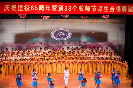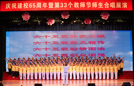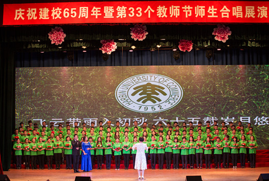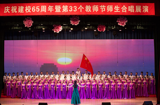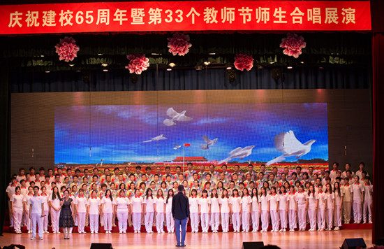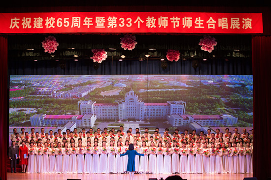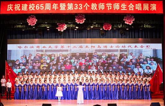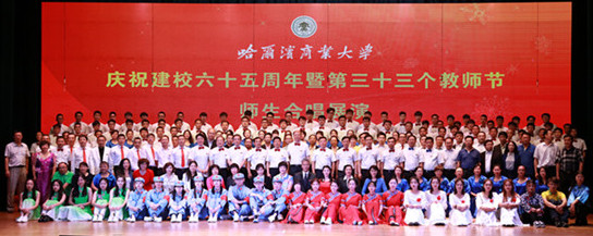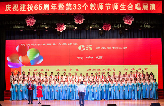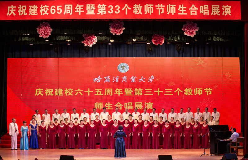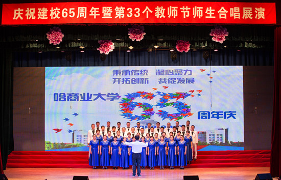 合唱展演活动在校领导参加的《众人划桨开大船》和全体教师合唱的校歌《诚信歌》声中落下帷幕。我们坚信,哈商大这艘已经驶过65个春秋的大船,必将在所有商大人的合力推动下,继续乘风破浪,奔向辉煌的远方。