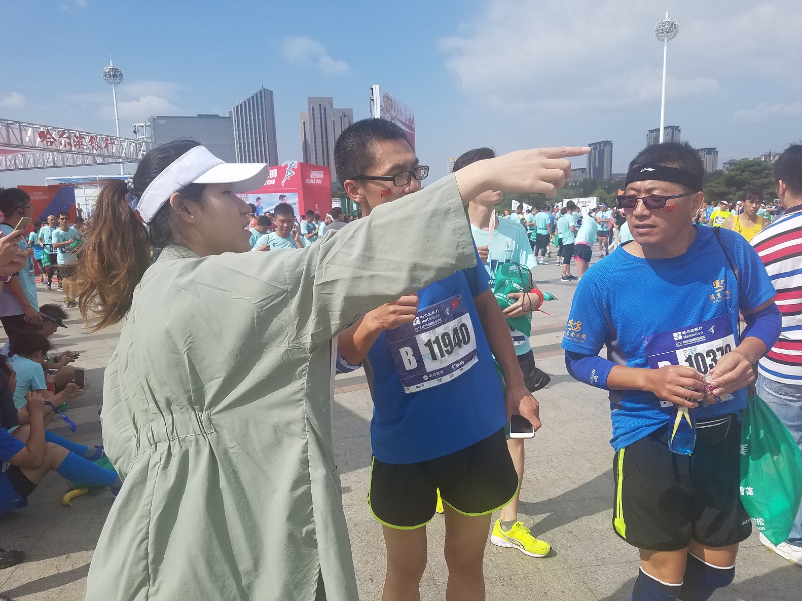 比赛现场,我校学子统一着装,结合培训时所学内容拿好指示牌,认真做着引导工作,在比赛的半程终点引导好运动员,在全程终点提示运动员们做好拉伸、泡脚,告知他们食品地点及个人物品存放地、如何按照路线返回驻地等,一丝不苟地完成着志愿服务工作。