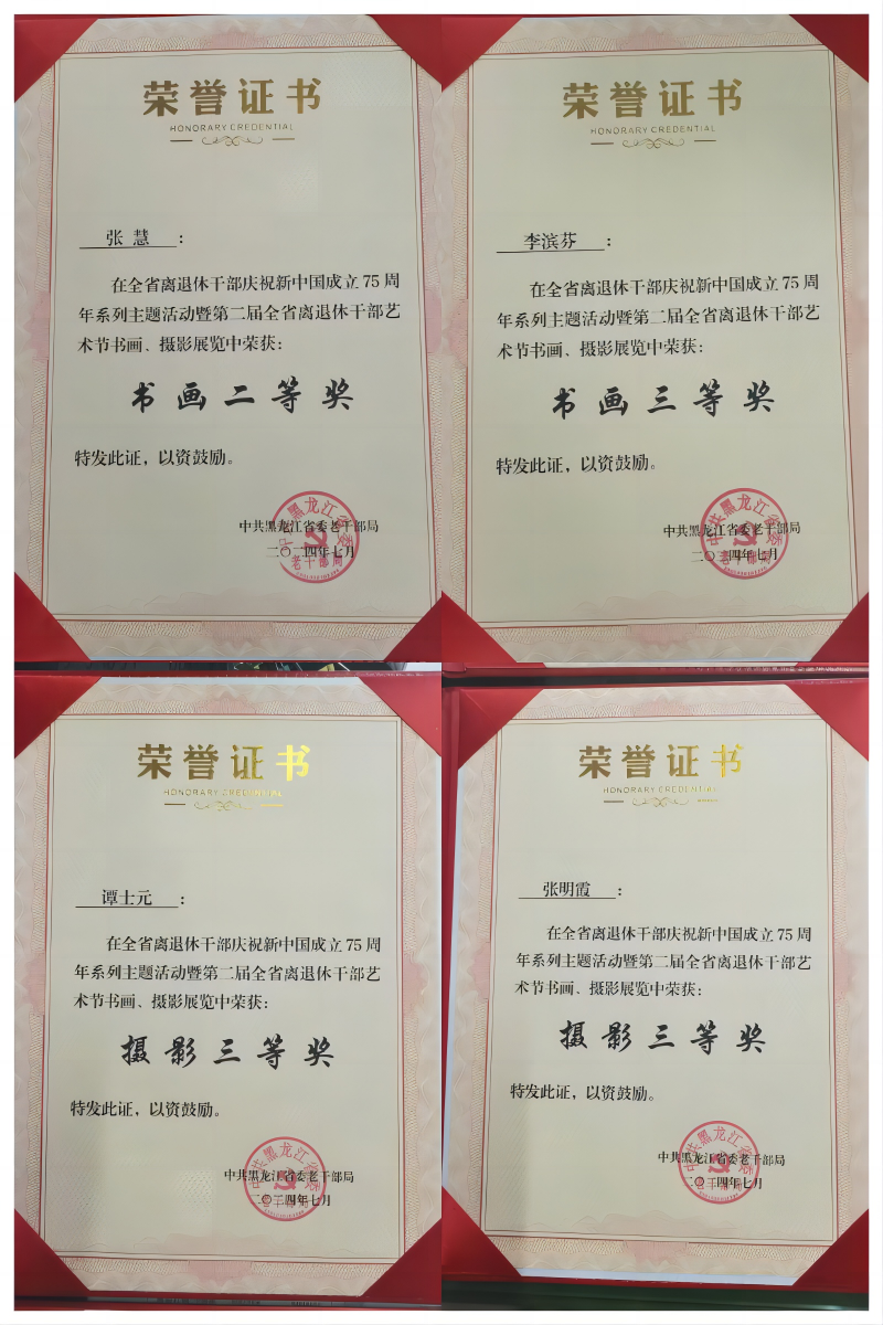 退休不褪色,桑榆守初心。活动中,离退休老同志们以书言志、以画寄情,创作出一幅幅有色彩、有温度、有分量的国庆献礼。经过推荐评选,我校4位教师的作品在全省离退休干部庆祝新中国成立75周年系列主题活动暨第二届全省离退休干部艺术节书画、摄影展览中喜获佳绩。张慧老师的绘画作品《吉祥》获得了书画二等奖、李滨芬老师的书法作品《古树》获得了书画三等奖、谭士元老师的摄影作品《夜幕下的松花江公路大桥》获得了摄影三等奖、张明霞老师的摄影作品《龙腾盛世》获得了摄影三等奖。