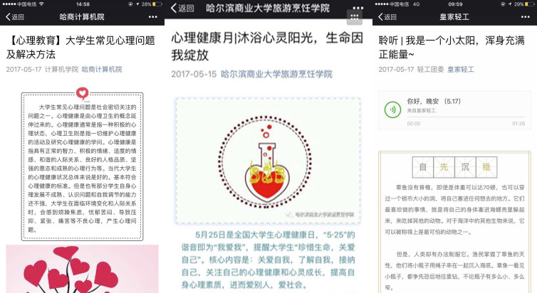 活动期间,各学院还利用微信公众号推送有关心理健康的相关知识和案例,各学院心理健康指导教师还为本学院学生开展了一系列心理健康讲座,在宣传普及心理健康知识的同时也为学生搭建起培养心理素质、提高心理承受能力的平台,营造了关注心理健康、重视心理健康的氛围。