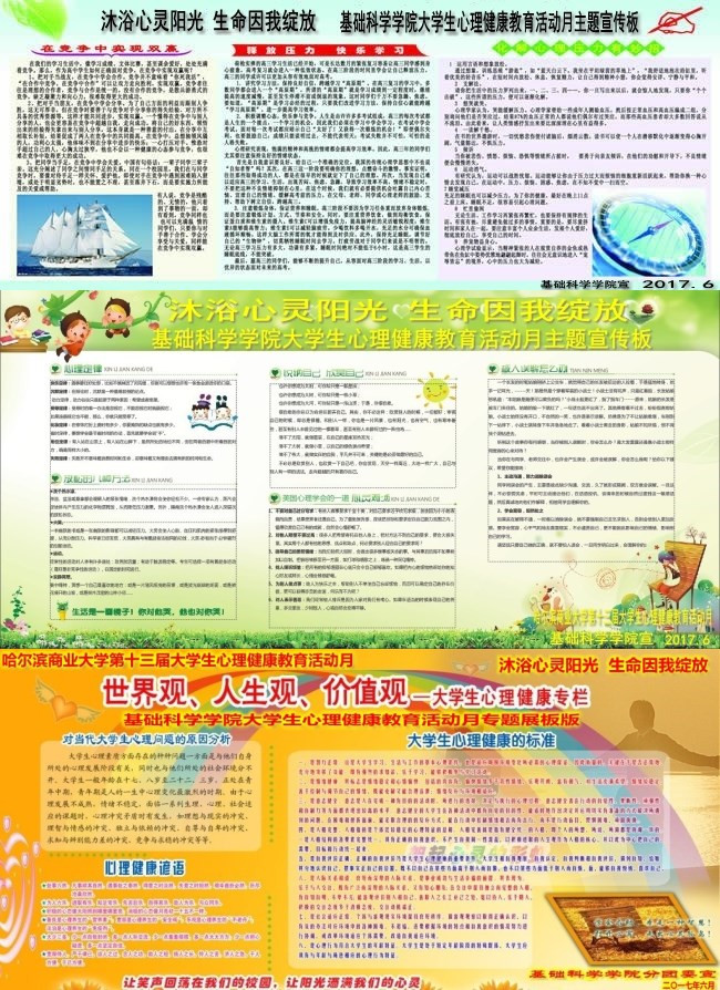 为了进一步开展我校大学生心理健康教育工作,深入贯彻落实《哈尔滨商业大学第十三届大学生心理健康教育活动月实施方案》,提高大学生心理素质,促进大学生身心和谐发展,2017年5月6日至6月6日,学生工作部(处)主办了我校第十三届大学生心理健康教育活动月系列活动,目前活动已经圆满落下帷幕。