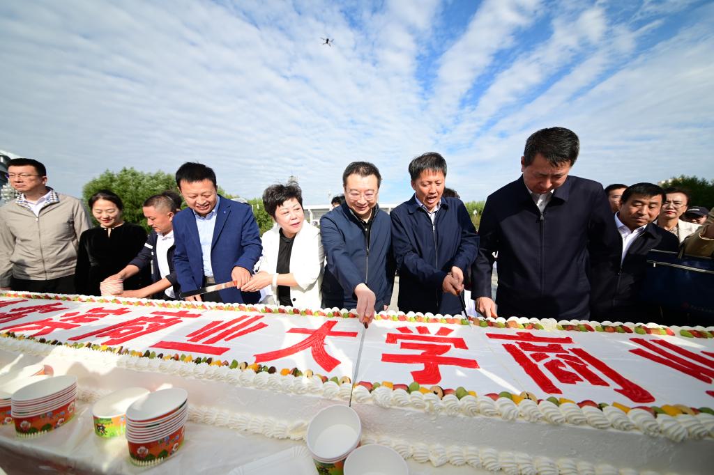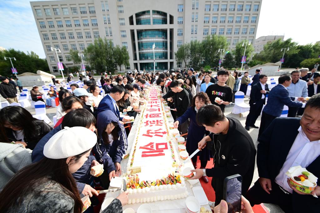 学校为本次商业文化嘉年华精心制作了一款长7.5米、宽73厘米的巨型蛋糕。7.5米的长度寓意着新中国成立75周年的辉煌征程,73厘米的宽度则象征着哈尔滨商业大学走过的73载春秋岁月。与会领导共同切分蛋糕,在场嘉宾和师生共同分享美味。