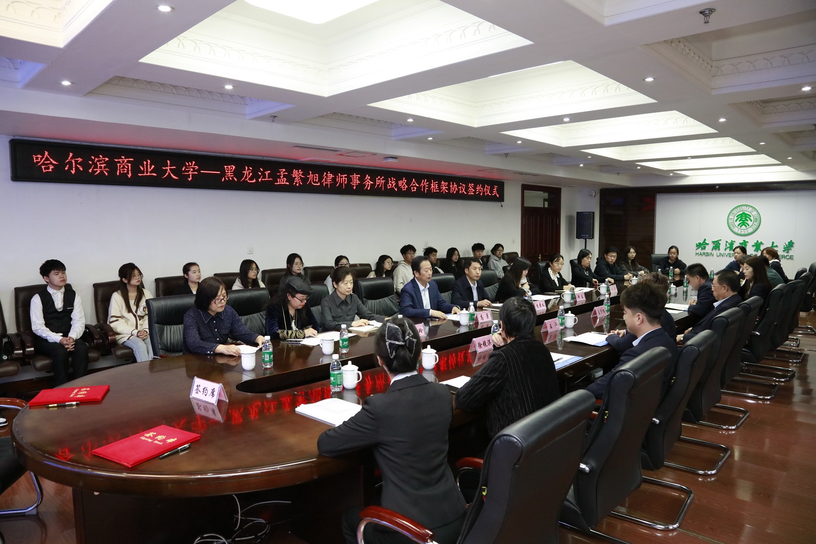 哈尔滨商业大学与黑龙江孟繁旭律师事务所战略合作框架协议签约仪式于9月25日上午在北校区行政楼三楼会议室举行。哈尔滨商业大学党委常委、副校长李景义;黑龙江孟繁旭律师事务所董事局主席孟繁旭、董事王洋、董事刘惠民、主席助理徐镜淇,及秘书局局长高原;哈尔滨商业大学法学院党委书记郑磊、院长高勇、党委副书记李萍、副院长杨姝玲,各教研室主任、教师,硕士研究生、本科生代表等参加签约仪式。签约仪式由高勇主持。