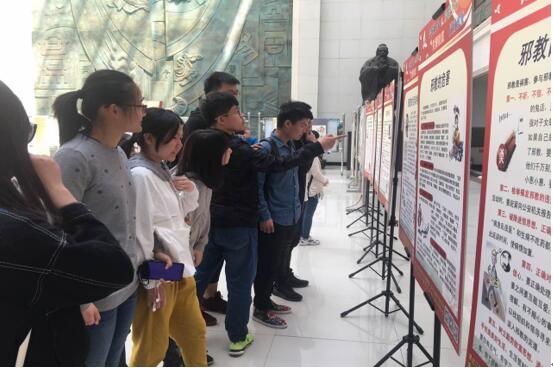 2017年5月22日,我校同时在南北校区举办了“反邪教警示教育活动展”。本次展览由学生工作部(处)主办,法学院和药学院共同承办,以“崇尚科学创文明,反对邪教树新风”为主题,对邪教进行了全面解读,使学生在知晓邪教违法犯罪活动的危害、活动特点和欺骗手段的同时,不断深化对反邪教警示教育工作的认识,切实提高学生自我防范识别邪教、自我反对抵制邪教的意识和能力,构建平安、和谐、稳定的育人环境。