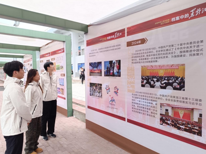 本次展览共分为“开启新元”“伟业初创”“文革时期”“革故鼎新”“时代新篇”五个部分,共计展板62张,展出图片400余幅,以独特的视角呈现了那些被时光定格的珍贵瞬间。每一份档案、每一张图片都鲜活的展现了黑龙江在祖国发展历程中的重要角色和光辉成就,见证了祖国75年来的发展与崛起。展览一经展出,便吸引了众多师生驻足观看,师生们在一块块展板前或轻声细读,或静默沉思,缅怀过往奋斗路,眺望前方新征程。