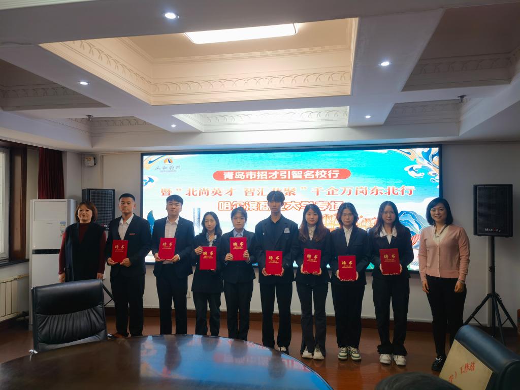 青岛鹏腾经济技术合作集团有限公司与我校旅游烹饪学院进行了签约。随后青岛市北区领导为学生颁发“市北区招才引智大使”聘书。