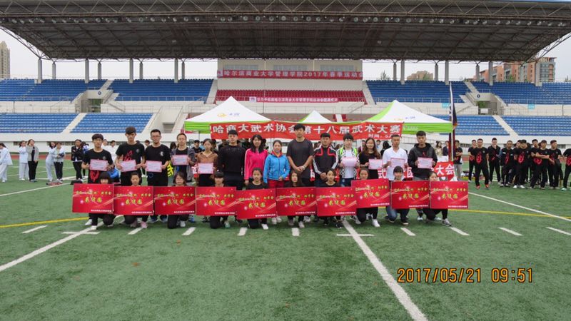 5月21日,在校团委和体育学院的大力支持下,由哈尔滨商业大学武术协会主办的校武术大赛在A区体育场举行。松北区武术协会、诚毅跆拳道馆、林业大学、理工大学、黑科技、哈信息工程等各大高校的武术协会到会参加了助兴演出。