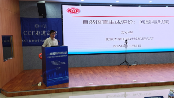 CCF自然语言处理专委会副主任、北京大学万小军教授作了题为《自然语言生成评价:问题与挑战》的精彩报告。报告剖析了自动评价和人工评价两类评价方法面临的若干问题和挑战,同时介绍了大模型在文本质量评价方面的潜力和可行性,以及其团队针对NLG评价所取得的部分研究进展。