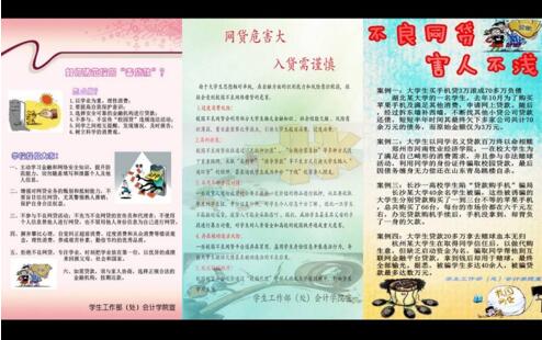 第二,开展网络安全和金融知识教育。以拒绝不良网贷、崇尚健康生活为主旨,通过班团会、报告会、讲座、学校、学院官方微信公众号等多种形式,向学生普及金融信贷知识、网络安全知识及相关法律法规知识,掌握诸如逾期还贷滞纳金、违约金等基本金融常识,让广大学生了解校园网贷的潜在风险,知晓不良网贷陷阱的各种形式,增强对网贷业务的甄别能力,增强学生网络金融安全意识和自我保护能力。