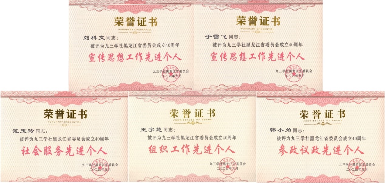 近日,我校九三学社基层委员会喜获九三学社黑龙江省委授予的“社会服务先进集体”“九莲助学先进集体”“参政议政工作先进集体”多项集体荣誉,社员王宇慧、于雪飞、刘科文、范玉玲、韩小为分别荣获组织工作、宣传思想工作、社会服务工作、参政议政工作“先进个人”荣誉称号。