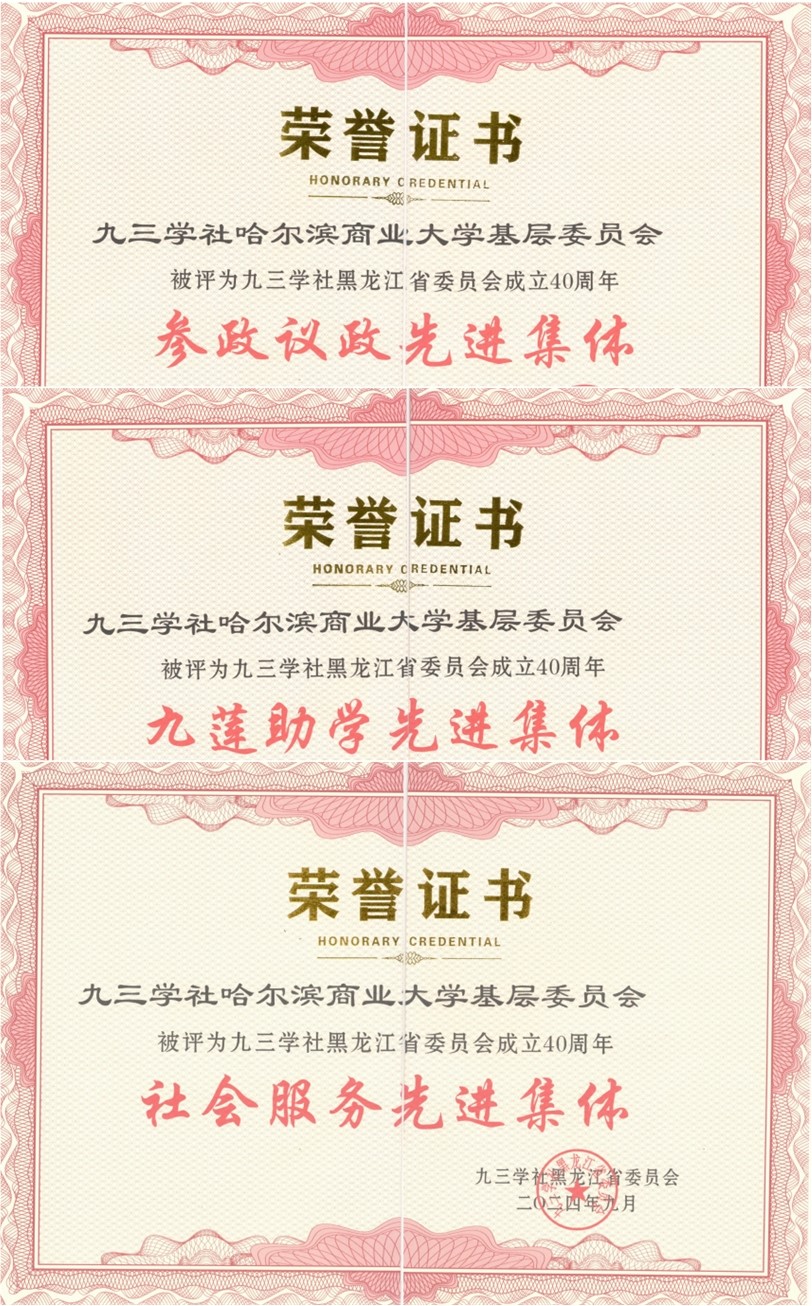 长期以来,九三学社哈商大基层委员会始终坚持政治引领、凝聚思想共识、不断加强自身建设,在参政议政、思想宣传等方面取得了优异成绩。九三学社哈商大基层委员会主委晏祖根表示,多项集体和个人荣誉的获得是九三学社黑龙江省委员会对我校基层委员会多年来工作的认可和肯定,九三学社商大基层委员会将珍惜荣誉,发扬传统精神,为助力龙江全面振兴全方位振兴作出更大贡献。九三学社哈商大基层委员会全体社员表示,要继续坚持与党同心、追求真理的坚定信念,充分发挥自身优势,积极履行参政议政职能,立足岗位建功立业,为龙江建设和学校发展贡献“九三人”的智慧和力量。