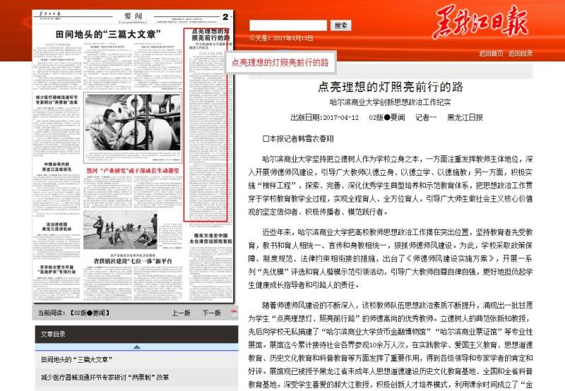 2017年4月12日,黑龙江日报(要闻)第二版以工作纪实的形式撰文“点亮理想的灯照亮前行的路——哈尔滨商业大学创新思想政治工作纪实”,大篇幅报道了我校近年来在创新思想政治工作,典型引领等工作中的积极探索和丰硕成果。