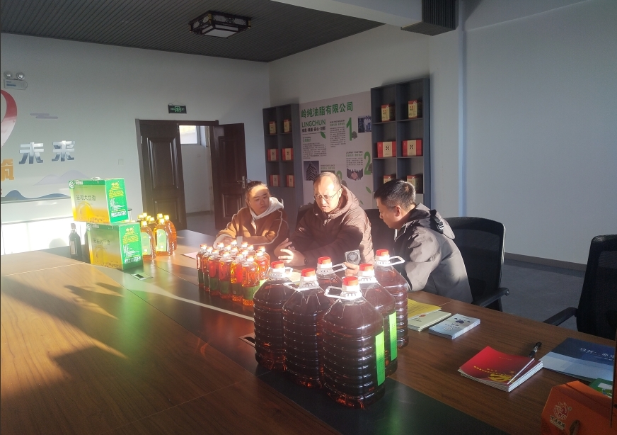 在呼玛镇岭纯油脂有限公司,张光与企业负责人王春雷就企业当前采用的冷榨制油技术进行了详细的讨论,并对生产加工过程中油脂菌落控制、优化榨油参数提升豆油油酸含量及品质等级等方面技术提出了建议。王春雷表示,这些技术指导对企业未来的发展具有重要意义。
