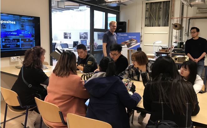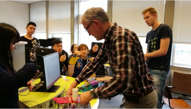 学术交流在英荷大学的四个校区——哈勒姆校区、代尔夫特校区、阿尔克马尔校区以及英荷大学下辖实验室进行,每一个校区的学习内容各有侧重。一行人参观了机械加工实验室、3D打印实验室、预制建筑实验室、航天风动实验室、新型材料实验室等。学生们跟随英荷大学的师生一起上课、一起做实验、自己动手进行3D打印、学习绘图软件现场进行零件三维设计、用新型纤维材料制作能承受100公斤重量的书架、测试材料的强度和韧性、动手组装集成电路板、用脆弱的意大利面制作坚固的建筑等,学习过程有趣且收获极大。交流活动中每一节课程,英荷大学都派有指定老师进行细致讲解。另外,还分享了荷兰学生的创意产品:360度全方位环绕3D打印设备、由下至上的建房工具、电子起重设备、模拟预制建筑、可伸缩桥梁等。
