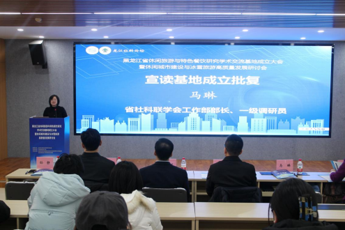 黑龙江省社科联学会工作部部长马琳通报基地审批情况并宣读基地成立批复。马琳介绍了全省学术交流基地的建设情况,她强调,省社科联高度重视并支持建设学术交流基地,旨在打造集学术建设、理论研究、学术交流、成果转化、咨政服务、普及推广等为一体的协同创新平台,省休闲旅游与特色餐饮研究学术交流基地要依托哈尔滨商业大学的学科优势和资源,促进学科交叉融合,整合研究力量,围绕特色文化旅游开发、生态旅游高质量发展、龙江餐饮传承创新研究等领域,深入研究阐释、咨政建言,为黑龙江省乃至全国的文化旅游产业发展提供智力支持。