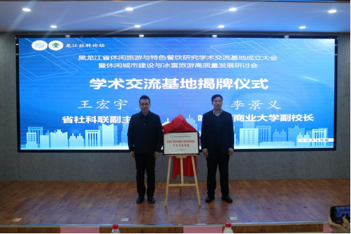 黑龙江省社科联副主席、党组成员王宏宇与哈尔滨商业大学党委常委、副校长李景义共同为基地揭牌。