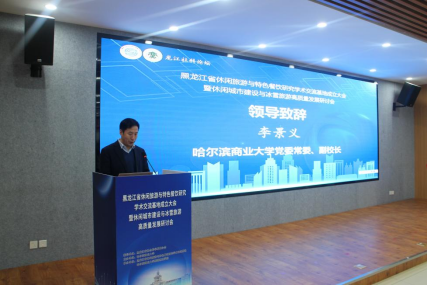 开幕式由哈尔滨商业大学旅游烹饪学院院长孙静主持。哈尔滨商业大学党委常委、副校长李景义在会上致辞并向参会嘉宾、专家学者表示欢迎,指出学术交流基地的成立和研讨会的举办是深入贯彻落实习近平总书记“冰天雪地也是金山银山”“大力发展特色文化旅游”重要指示精神的具体实践,是响应国家关于推动文化和旅游深度融合发展的重要举措,不仅为学校师生提供了一个与业界精英、专家学者深入交流的平台,更为推动黑龙江省休闲旅游与特色餐饮产业的创新发展提供了有力支撑。