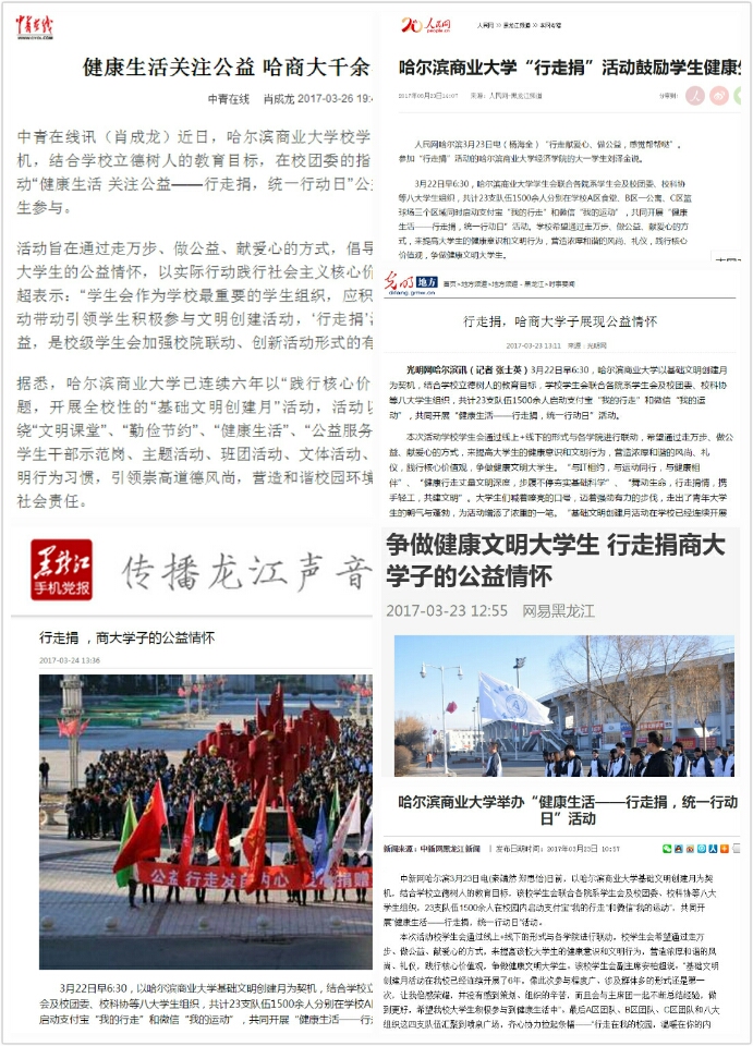公益一小步,健康一大步。据统计,截至活动结束,商大学子通过“行走捐”的方式已经捐出4000余元,近2200万步。健康+公益的活动理念,新颖的活动形式不仅吸引了学生们的广泛参与,同样吸引了多家媒体的关注报道,中国青年报官方网站中青在线、人民网、光明网、中国新闻网、东北网、黑龙江手机党报等媒体对活动进行了报道,吸引了广泛的关注。