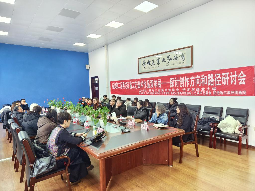12月30日下午,由黑龙江省美术家协会、哈尔滨商业大学主办,哈尔滨商业大学设计艺术学院、黑龙江省美术家协会工艺美术艺委会、民进哈尔滨开明画院承办的“备战第二届黑龙江省工艺美术作品双年展——探讨创作方向和路径研讨会”在我校南区顺利举行。我校设计艺术学院党委书记陈明军、副院长丁凌云、教授王宝成,黑龙江省美术家副主席刘钻、黑龙江省美术家协会副主席池颖红、东方学院艺术学院院长张建设、黑龙江省书法家协会副主席卢海娇、黑龙江美术家协会工艺美术艺委会主任杨眉、民进哈尔滨市委秘书长宫丽娟、黑龙江省美术家协会美术教育委员会主任唐卫强、黑龙江省美术家协会工艺美术艺委会副主任吴赛、东北农业大学艺术学院教授王贵宾、哈尔滨市精工上品总经理刘刚、黑龙江省美术家协会漆画艺术委员会副主任赵庆峰等参加会议。会议由黑龙江省美术家协会工艺美术艺委会副主任、我校设计艺术学院副院长丁凌云主持。
