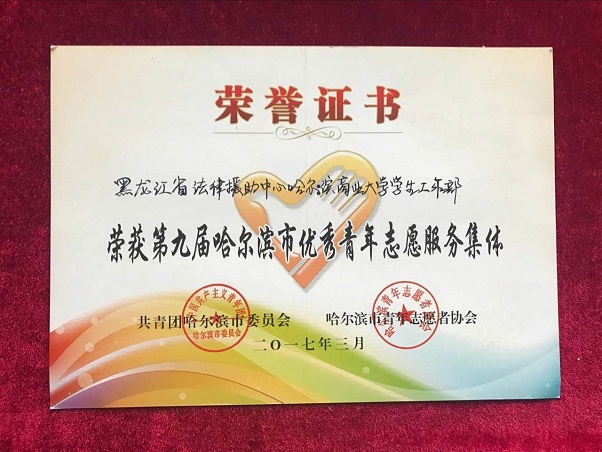 2017年3月,共青团哈尔滨市委、哈尔滨市青年志愿者协会授予黑龙江省法律援助中心哈尔滨商业大学学生工作部“第九届哈尔滨市优秀青年志愿服务集体”称号。这一荣誉的取得,表明了法援工作部的志愿服务工作在校团委和法学院的双重领导下,在工作部全体青年志愿者的共同努力下得到了全面的提升和发展。